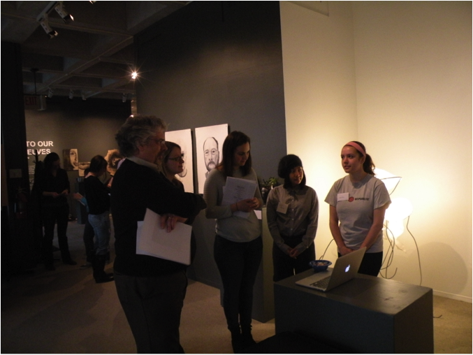Student playing Georges Petit presenting his gallery’s artists to a potential buyer in the alcove of the Handwerker Gallery