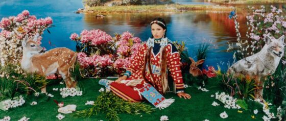 Decolonial critiques also reshaped understandings of environmental art, challenging the settler-colonial notion of wilderness as an unpeopled space. It reinforced institutional critiques associated with Conceptual Art that questioned the unconscious biases and material inequities that support art institutions like museums and galleries, and which determine what artworks (and by extension, which communities and demographics) get to be seen as valuable for the public. The American Indian Movement foregrounded Indigenous sovereignty, while postcolonial theory analyzed how exoticism and “noble savage” tropes perpetuated colonial ideologies. Wendy Red Star’s Spring from The Four Seasons (2006) engages these critiques through staged, photographic self-portraits in artificial “natural” settings. Wearing traditional Apsáalooke (Crow) regalia against kitschy backdrops, she both inhabits and undermines stereotypes of Native women, revealing the artificiality of nature images that can exist in EuroAmerican museums of natural history. Native people have been treated by scientific institutions just as fake and sterile as the plastic animals that populate the life habitat setting she places herself in.